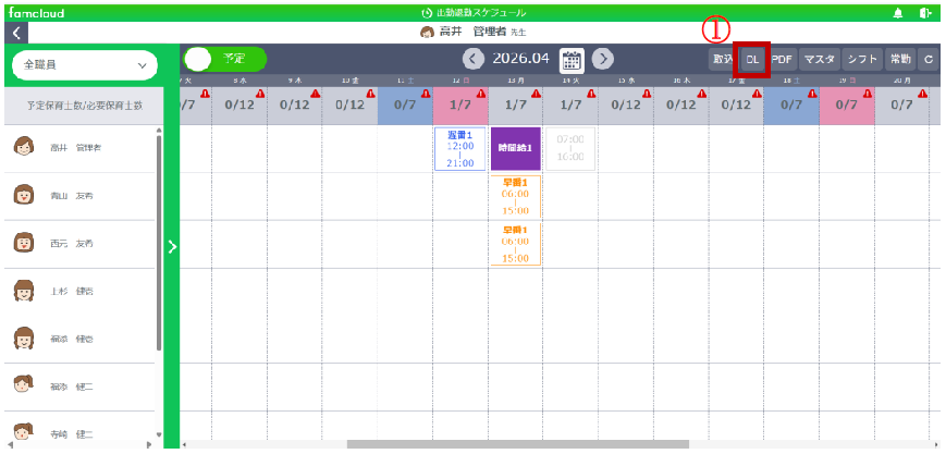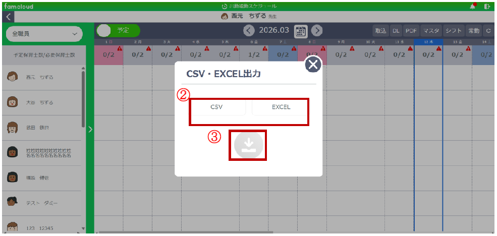 ※【設定】メニューの【出勤退勤】の「シフト権限・期限」で権限が「自分のみ」の場合、自身以外の保育士は出力されません。