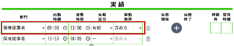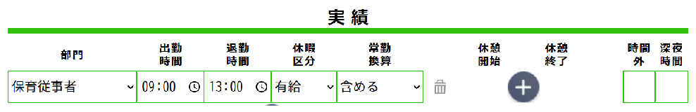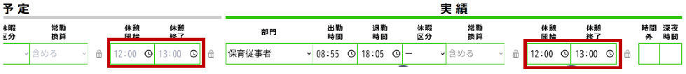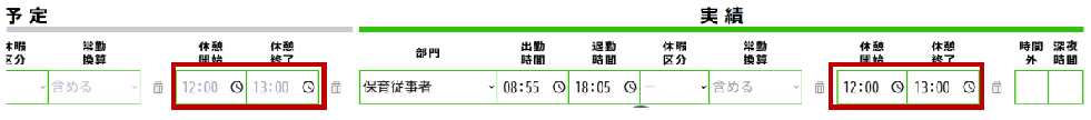 予定が登録されていない場合、設定・出勤退勤の職員毎に登録した休憩時間が登録されます。